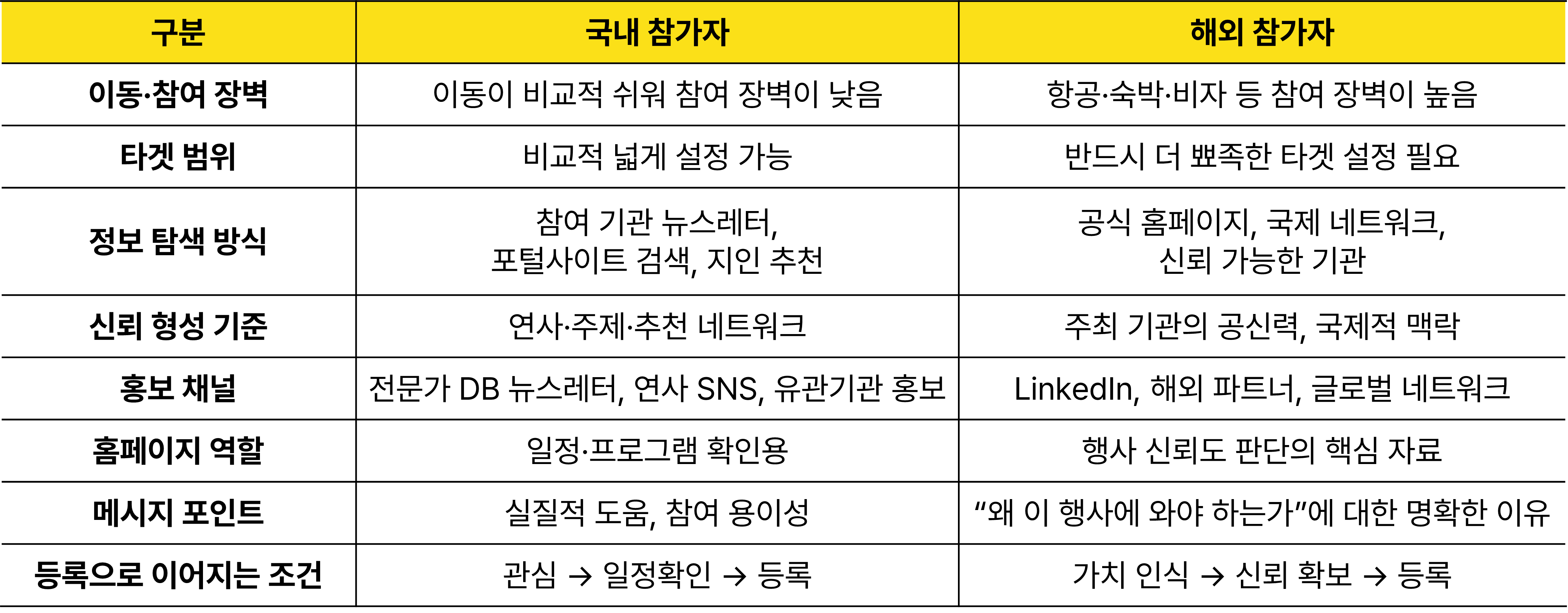 ํ๋ณด์ ํต์ฌ์ โ์ผ๋ง๋ ๋๋ฆฌ ์๋ฆด ๊ฒ์ธ๊ฐโ๋ณด๋ค โ๊ด์ฌ ์๋ ์ฌ๋์๊ฒ ์ ํํ ๋๋ฌํ๊ณ , ๋ฑ๋ก๊น์ง ์ด์ด์ง๊ฒ ํ ๊ฒ์ธ๊ฐโ์ ๊ฐ๊น์ต๋๋ค. ์ด ๊ด์ ์์ ๋ณด๋ฉด ๊ตญ๋ด ์ฐธ๊ฐ์์ ํด์ธ ์ฐธ๊ฐ์๋ฅผ ๊ฐ์ ๋ฐฉ์์ผ๋ก ํ๋ณดํ๋ ๊ฒ์ด ์คํ๋ ค ๋นํจ์จ์ ์ด๋ผ๋ ์ ์ด ๋ถ๋ช
